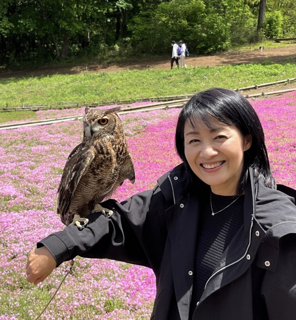 芝のピークは終わっていたのですが、そこに登場した、やたらと存在感を放っていたミミズクちゃん。思わず駆け寄って行き、ご主人に声をかけ写真を撮らせてもらっていたら、あっという間に人だかりができ、写真撮影会になりました。ミミズクを腕に乗せてもらい、芝桜より大満足したのでした。