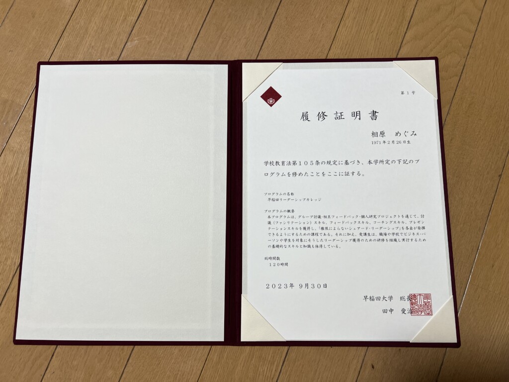 届いた履修証明書は、予想以上にとても立派で驚きましたが、